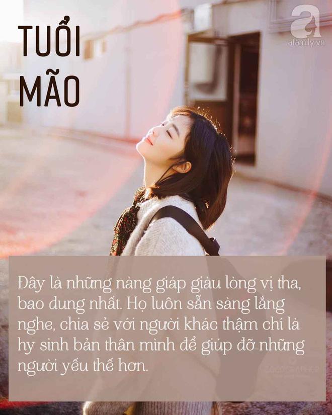 Cô nàng tuổi Mão có trái tim nhân hậu, tâm hồn thanh tao và dịu dàng. Rất nhiều người yêu quý tuổi Mão bởi sự cởi mở, tốt tính của họ. Đây còn là những nàng giáp giàu lòng vị tha, bao dung nhất. Họ luôn sẵn sàng lắng nghe, chia sẻ với người khác thậm chí là hy sinh bản thân mình để giúp đỡ những người yếu thế hơn.