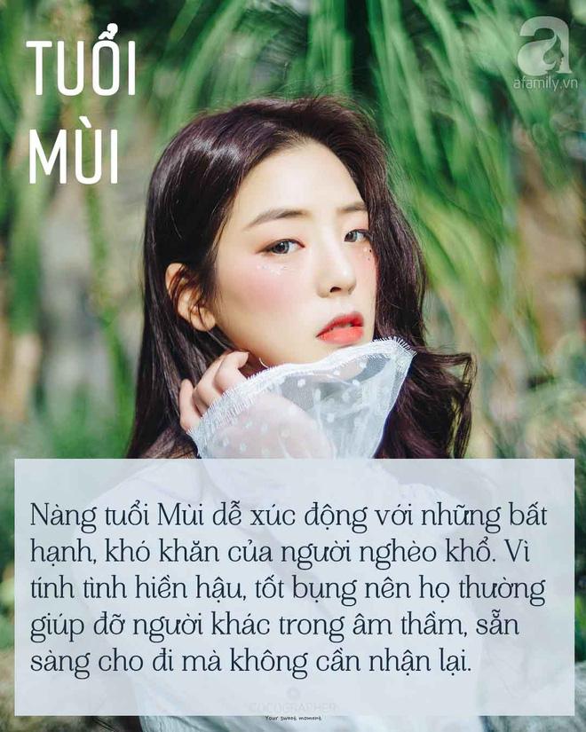 Những cô nàng tuổi Mùi là những người đại diện cho sự nhẹ nhàng, tử tế. Trái tim của nàng rất đơn giản, nhân hậu, tốt bụng và không bao giờ ảo tưởng về con người. Đồng thời, họ luôn tỏ ra rất tử tế và thích giúp đỡ người khác. Nàng sống giàu tình cảm và đầy lòng trắc ẩn, yêu thương con người. Nàng tuổi Mùi dễ xúc động với những bất hạnh, khó khăn của người nghèo khổ.