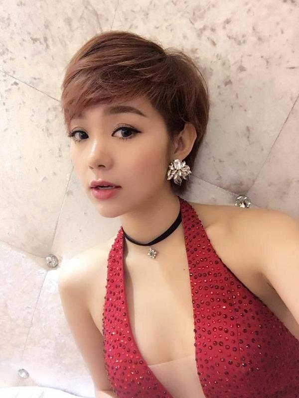 Gương mặt Uyên Linh khá dài với hai quai hàm góc cạnh, phù hợp với kiểu tóc tém.