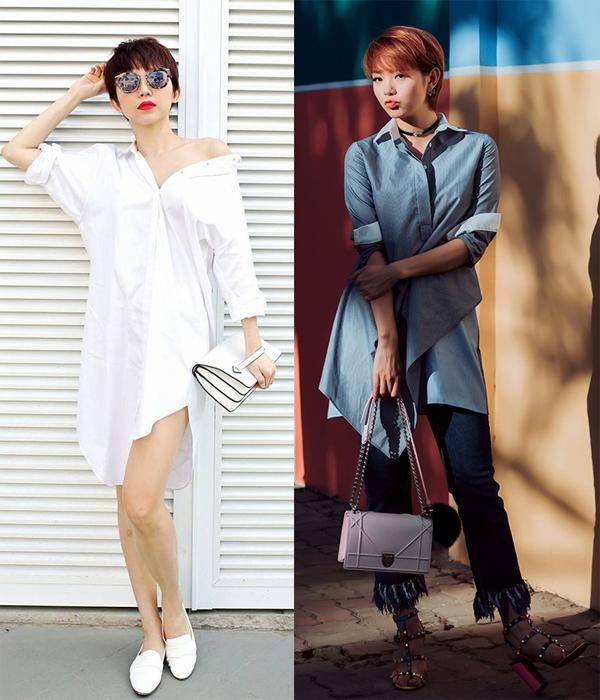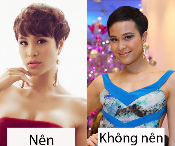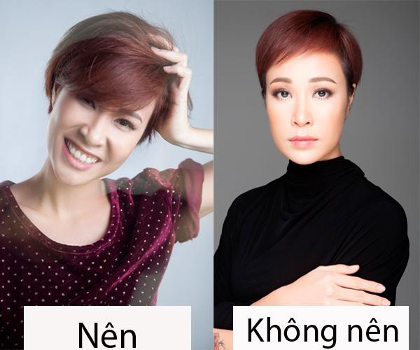 Tóc pixie quá ngắn ở hình bên phải khiến Phương Mai thô kệch, kém gợi cảm hẳn đi.