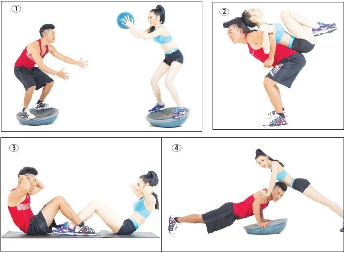 Chuẩn bị: Đứng thăng bằng trên bóng bosu, khuỵu gối. Nam cầm bóng.