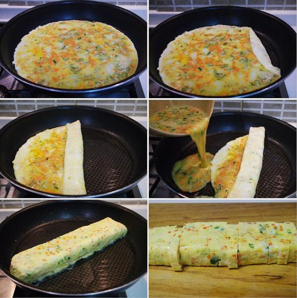 Tương tự cách cuộn trứng với món trứng cuộn lá tía tô và trứng cuộn há cảo. Bạn làm nóng chảo dầu trên bếp, chia trứng thành 2 phần, đổ ½ chỗ trứng láng đều mặt chảo. Cuộn tròn miếng trứng, rồi gạt miếng trứng cuộn vào một bên thành chảo, đổ tiếp ½ chỗ trứng còn lại láng đều mặt chảo rồi tiếp tục cuộn miếng trứng trong lớp trứng vừa tráng. Cắt trứng thành từng khoanh dày 1,5cm.