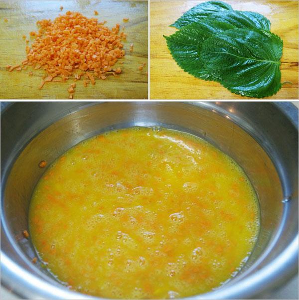 Đầu tiên, bạn rửa sạch cà rốt băm nhỏ. Lá tía tô rửa sạch, để ráo nước. Bạn đập 8 quả trứng vào bát đánh tan cùng với muối, sau đó bỏ cà rốt băm nhỏ vào trộn đều.