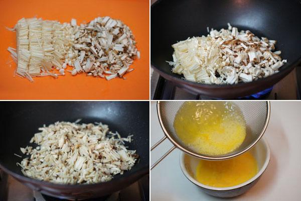 Đầu tiên, bạn rửa sạch nấm đông cô, nấm kim châm và cắt nhỏ. Làm nóng chảo dầu trên bếp, cho nấm đông cô, nấm kim châm vào chảo xào, thêm chút muối đảo đều nhanh tay. Tiếp theo, bạn đập 5 quả trứng vào bát, đánh đều lọc qua rây cho mịn.