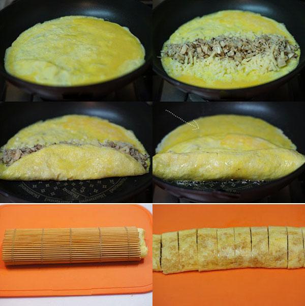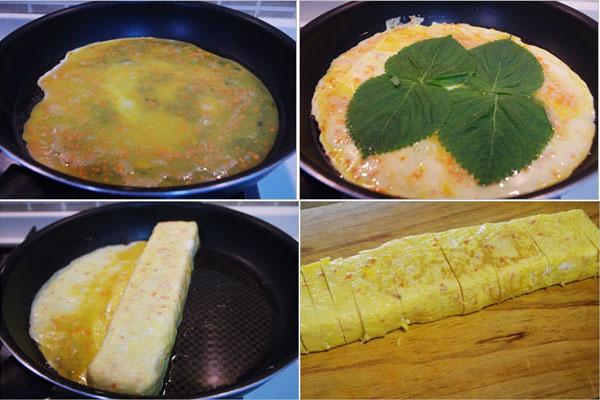 Tương tự cách cuộn trứng với món trứng cuộn lá tía tô và trứng cuộn há cảo. Bạn làm nóng chảo dầu trên bếp, chia trứng thành 2 phần, đổ ½ chỗ trứng láng đều mặt chảo. Cuộn tròn miếng trứng, rồi gạt miếng trứng cuộn vào một bên thành chảo, đổ tiếp ½ chỗ trứng còn lại láng đều mặt chảo rồi tiếp tục cuộn miếng trứng trong lớp trứng vừa tráng. Cắt trứng thành từng khoanh dày 1,5cm.