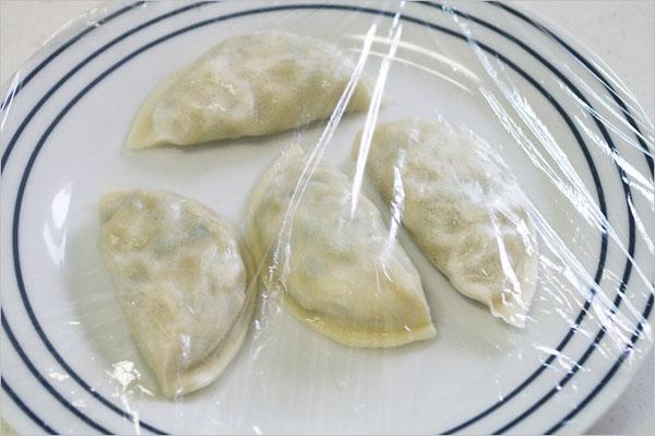 Làm nóng chảo dầu trên bếp, chia trứng thành 2 phần, đổ ½ chỗ trứng láng đều mặt chảo. Đặt 4 bánh há cảo sát thành chảo và cuộn tròn, rồi gạt miếng trứng cuộn vào một bên thành chảo, đổ tiếp ½ chỗ trứng còn lại láng đều mặt chảo rồi tiếp tục cuộn miếng trứng trong lớp trứng vừa tráng. Cắt trứng thành từng khoanh dày 1,5cm.