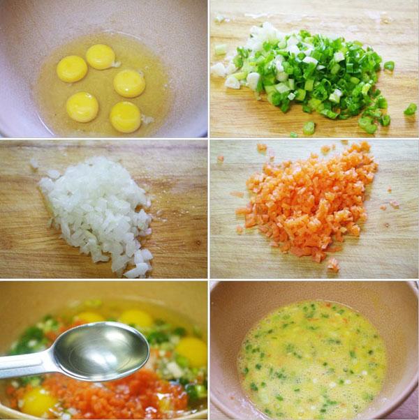 Bạn đập 5 quả trứng vào bát. Hành lá, hành tây, cà rốt rửa sạch băm nhỏ. Tiếp theo, bạn cho hành lá, hành tây, cà rốt băm nhỏ cùng với muối và rượu matsul vào bát trứng trộn đều.