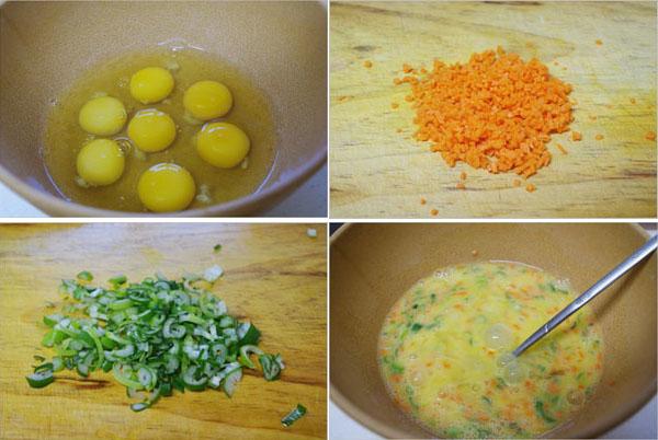 Đầu tiên, bạn đập 7 quả trứng vào bát. Cà rốt rửa sạch băm nhỏ, lá hành rửa sạch băm nhỏ. Bạn cho cà rốt, lá hành băm nhỏ vào bát trứng cùng với muối trộn đều.