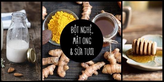 Bạn cần trộn 2 thìa cà phê sữa tươi, 1 thìa cà phê mật ong và 1 thìa cà phê bột nghệ rồi đắp lên các nốt mụn thâm. Để trong hỗn hợp trên mặt trong 15 phút, sau đó rửa sạch bằng nước ấm.