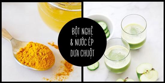 Bạn trộn 1 thìa cà phê bột nghệ với 2 thìa cà phê nước ép dưa leo đã bỏ bã rồi thoa lên vùng da bị sẹo do mụn trứng cá. Để cho hỗn hợp này hấp thụ vào da trong ít nhất 15 phút rồi dùng nước rửa mặt sạch. Để mang lại hiệu quả trị sẹo, bạn nên đắp mặt nạ này 2-3 lần/ tuần.