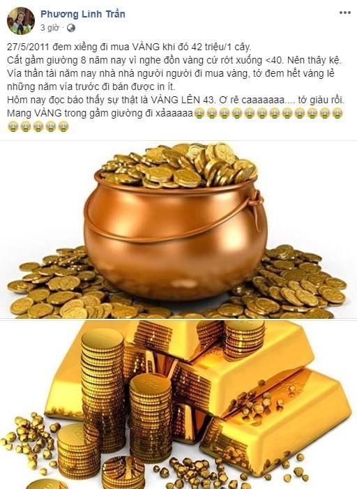 Theo đó vào năm 2011, cô đã mua khối lượng vàng lớn về cất dưới gầm giường. Suốt 8 năm qua cô vẫn chưa động đến vì vàng rớt giá. Tuy nhiên thời điểm vàng tăng, Phương Linh quyết định "xả" hết.