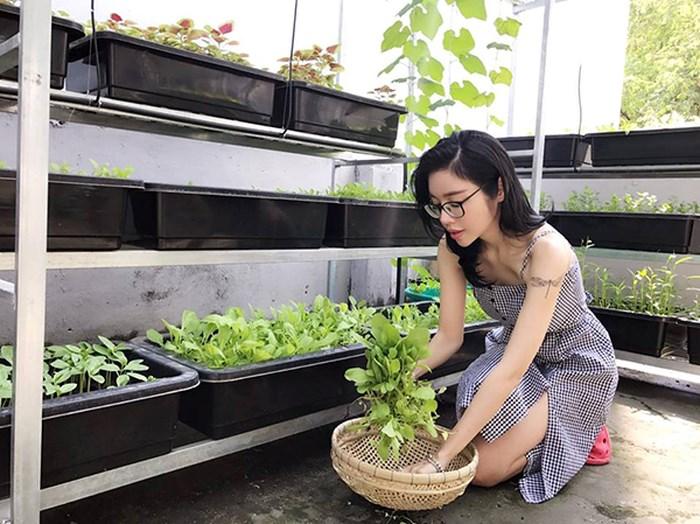 Người đẹp còn trồng cả một vườn rau sạch trên sân thượng để phục vụ bữa ăn sạch hàng ngày.