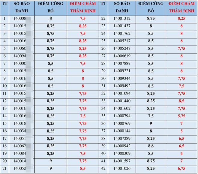 42 thí sinh trong danh sách có điểm số sau chấm thẩm định chênh lệch so với điểm công bố hôm 11/7 từ 0,25 đến 4,5 điểm. Một số trường hợp điểm tăng so với điểm ban đầu.