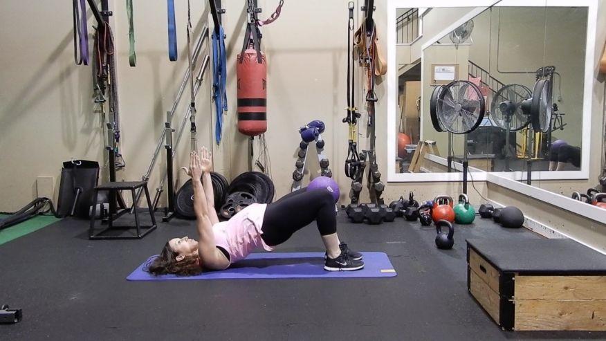 Nằm trên thảm, chân hơi co lại, đặt một quả bóng hơi nhỏ giữa hai đầu gối. Từ từ đẩy người lên cao và nâng hông của bạn lên, cho đến khi hông, lưng và cổ tạo thành một đường thẳng.