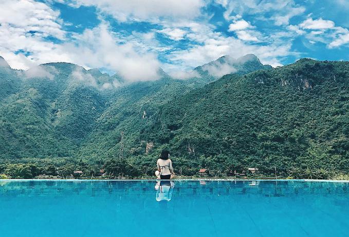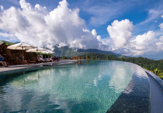 Từ bể bơi, khách du lịch có thể ngắm nhìn xa xa là dãy núi Hoàng Liên Sơn hùng vĩ, ẩn hiện giữa những áng mây bồng bềnh, thửa ruộng bậc thang phía dưới thung lũng Mường Hoa với những ngôi nhà đơn sơ của người dân tộc thiểu số.