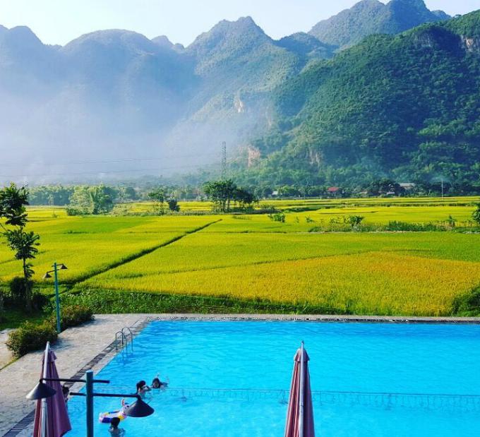 Bể bơi ngoài trời nhìn thẳng ra dãy núi trập trùng xen lẫn mây trời, đẹp ngút ngàn. Ngoài bể bơi, khu nghỉ còn có một khu vườn rộng lớn để bạn và gia đình hoà mình vào thiên nhiên núi rừng Mai Châu. Nơi này cũng rất thích hợp với gia đình có con nhỏ. Hơn nữa, từ Hà Nội lên Mai Châu, quãng đường di chuyển khá gần nên rất thuận tiện.