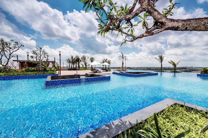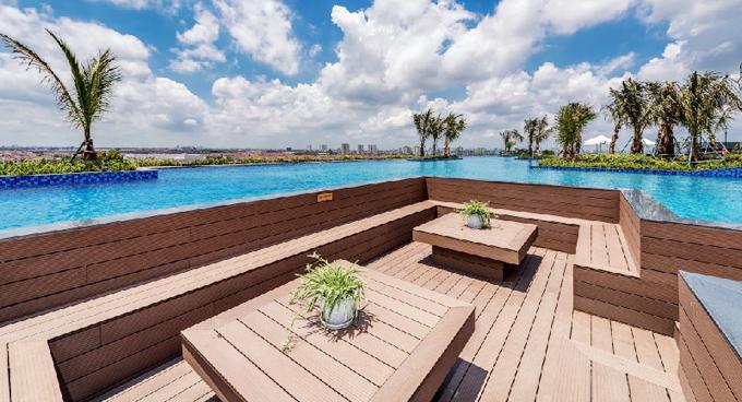 Ngoài khu vực bể bơi, du khách cũng có thể thư giãn, nghỉ ngơi ở 4 mini pool bar xen kẽ hồ bơi theo phong cách hiện đại. Điểm đặc biệt nhất là diện tích mảng xanh và thảm thực vật rộng 420 m2 được thiết kế hợp lý. Các bồn cây được bố trí cả trên cạn và dưới nước khiến cho không gian sinh thái hài hòa và sinh động.
