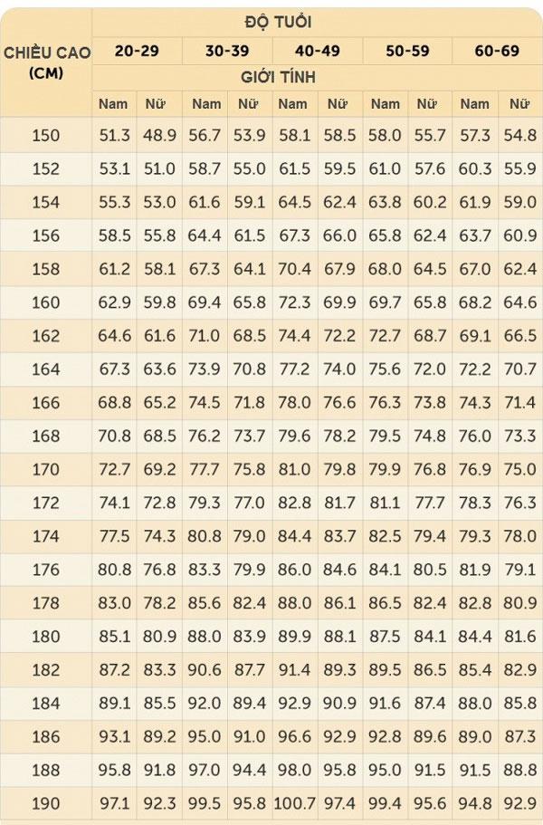 Bảng so sánh giúp bạn xác định chỉ số BMI chuẩn theo từng độ tuổi và chiều cao