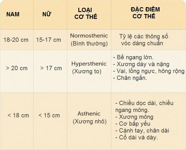 Đây là thông số cụ thể xác định loại hình cơ thể của từng người, chu vi cổ tay bình thường của nam giới là 18-20 cm, nữ giới là 15-17 cm.