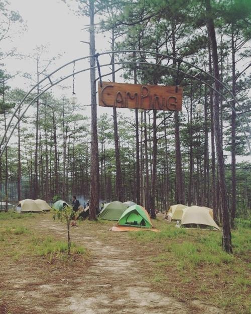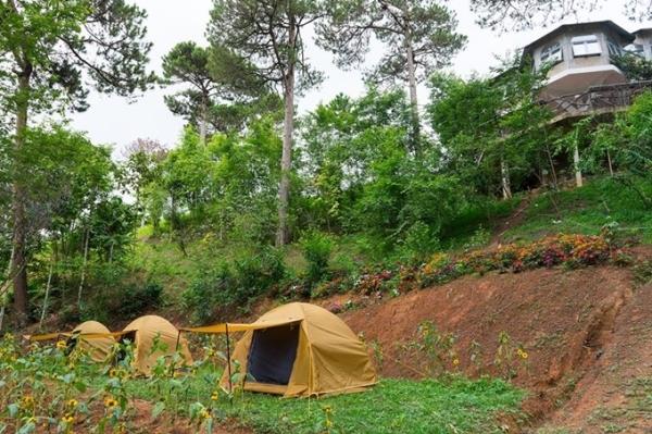 Trong khuôn viên khu nhà cũng có lều cho các nhóm du khách muốn trải nghiệm cắm trại giữa vườn hoa, rừng thông.
