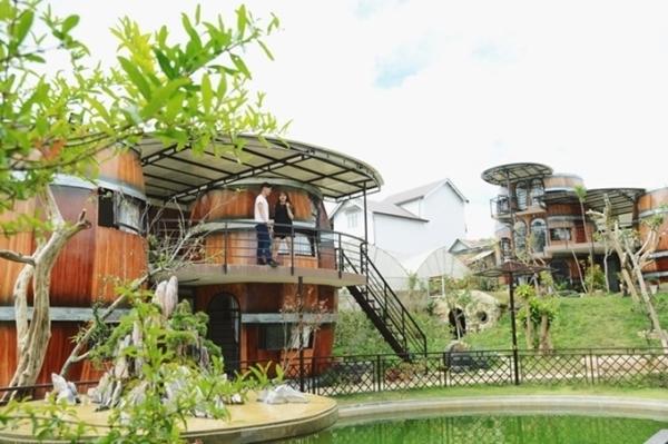 Khu lưu trú gồm nhiều phòng hình thùng rượu vang nằm trong thung lũng có diện tích hơn 1.000 m2, bao quanh là những ngọn đồi nhỏ và vườn hoa. Phòng nghỉ xây bằng bê tông, sơn giả gỗ bên ngoài, xây thành từng cặp thùng rượu vang với chiều cao khác nhau. Thùng lớn có 3 tầng, thùng nhỏ 2 tầng.