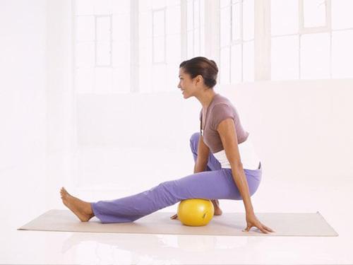 Tư thế ngồi nghiêng bên trái, đặt bóng dưới mông trái, chân trái thẳng, chân phải vòng phía trước. Đặt tay phải trên sàn gần hông phải, tay trái dùng lực nâng mông lên lăn bóng dọc trên mông trái và đùi trái để cho độ căng của bóng ép đùi khoảng 10 giây kết hợp hít vào, sau đó trở về vị trí ban đầu kết hợp thở ra.