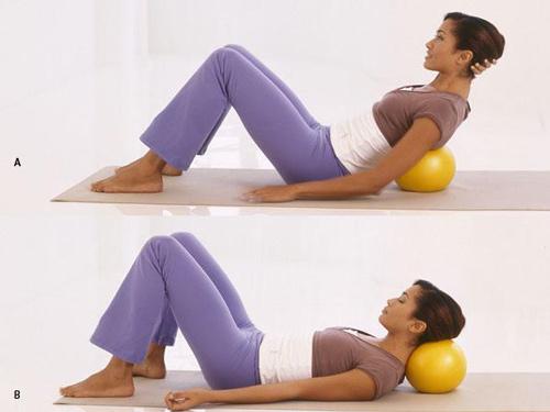 B. Vẫn ở tư thế nằm, bóng đặt dưới cổ, hai tay đặt hai bên dùng lực nâng người lên hít vào rồi nhẹ nhàng đặt xuống thở ra. Ích lợi của động tác này là kéo dài cột sống, giảm đau lưng, đốt cháy năng lượng và săn chắc vòng eo.