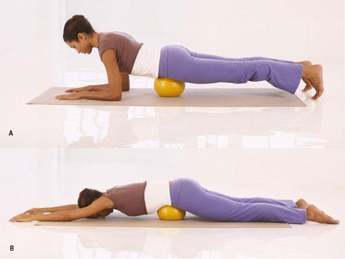 Trở lại tư thế nằm úp ban đầu kết hợp thở ra. B. Mở rộng hai cánh tay ra phía trước, lòng bàn tay úp, thực hiện ép bụng vào bóng rồi hít vào, sau đó lăn bóng nhẹ nhàng ở bụng dưới rồi thở ra. Động tác này giúp cơ thể đốt cháy calo, đem đến vòng eo săn chắc.