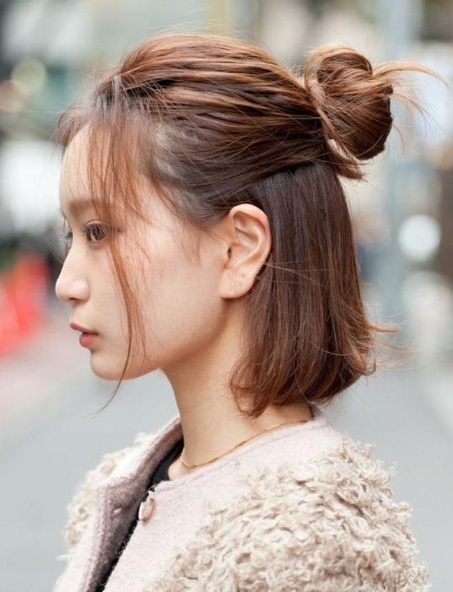 Nếu bạn nghĩ tóc búi chỉ dành cho những bạn nữ tóc dài thì thật sai lầm. Tóc ngắn đúng là khó khăn hơn trong việc buộc các sợi tóc với nhau, nhưng bạn có thể búi nửa đầu, vừa đẹp lại cá tính.