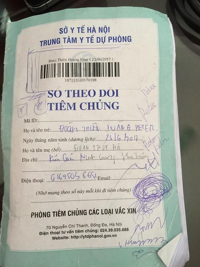 Như để minh chứng cho việc mình vẫn chăm sóc con tử tế, chị Hà rút từ trong chiếc túi đang đeo quyển sổ theo dõi tiêm chủng của con. Cuốn sổ ghi tên đứa bé là Đoàn Thiên Hoàng Peter, sinh ngày 23/6/2017, mẹ là Đoàn Thúy Hà, địa chỉ ở Kiến Quốc – Ninh Giang – Hải Dương.