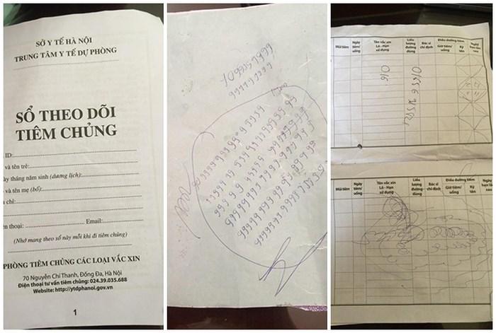 Bìa trong, bìa ngoài và cả phía trong cuốn sổ, nhiều chỗ chi chít những hình vẽ loằng ngoằng. Các trang ghi chú mũi tiêm trống trơn, duy chỉ có 2 mũi tiêm được ghi chú đã thực hiện là tiêm phòng viêm màng não cầu khuẩn BC tiêm ngày 23/3/2018 (mũi tiêm nhắc lại vào ngày 23/5/2018 nhưng chưa được thực hiện) và tiêm phòng sởi – quai bị - rubella tiêm ngày 29/3/2018 (mũi tiêm nhắc lại vào ngày 22/9/2018).