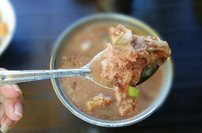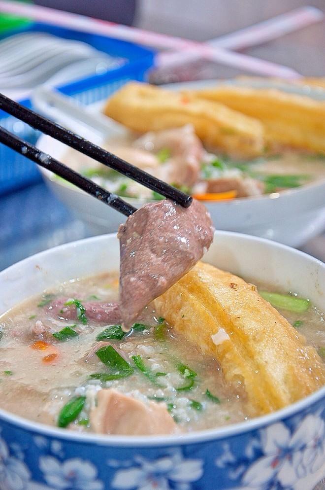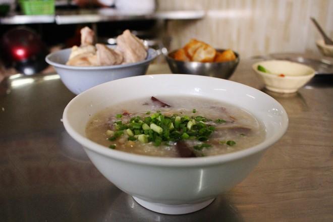 Tô cháo nóng hổi, thơm lừng và đầy mực khô, tiết, da heo, quẩy, tạo cảm giác no đủ cho thực khách. Gừng tươi xắt nhuyễn phủ lên mặt cháo để tăng độ cay và hương thơm.
