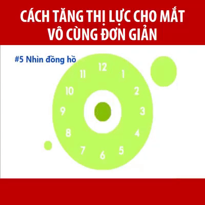 Tập trung nhìn vào một điểm gần trước mắt sau một vài giây. Sau đó phóng tầm mắt ra, nhìn vào một điểm xa trong một vài giây. Làm động tác này 5 - 7 lần trong ngày.