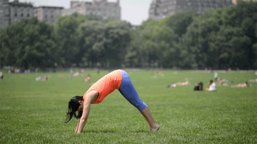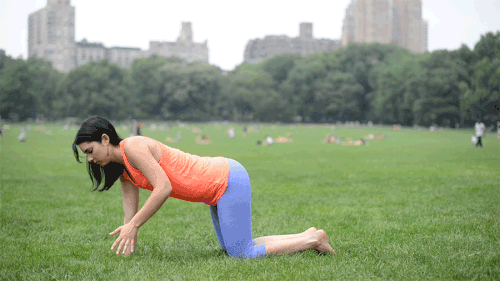 Động tác Downward Dog: Ngồi làm việc cả ngày khiến cơ lưng và xương hông của bạn chịu nhiều áp lực. Thực hiên động tác bằng cách chống 2 tay và đầu gối xuống đất. Sau đó nhẹ nhàng thu người và đẩy mông lên cao, giữ cho các cơ căng và thư giãn hết cơ. Giữ nguyên tư thế trong 5 nhịp thở.