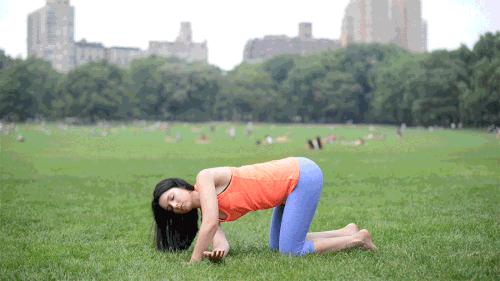 Động tác Thread The Needle: Động tác này giúp thả lỏng các cơ bả vai sau một ngày dài làm việc. Bạn chuẩn bị tư thế hai tay và hai đầu gối chống xuống đất. Đưa tay phải sang bên trái và vặn mình sao cho vai phải chạm xuống đất. Giữ động tác trong 3 nhịp thở và lặp lại động tác với tay trái.