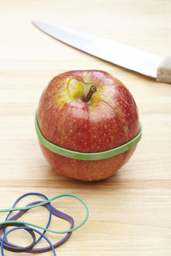 Bạn muốn cắt sẵn táo ra, cho vào tủ lạnh cho tiện nhưng lại lo táo bị thâm, mất ngon. Vấn đề sẽ được giải quyết chỉ nhờ vài sợi dây thun. Sau khi cắt táo ra, bạn xếp lại thành hình nguyên quả và dùng dây thun buộc lại. Nó sẽ giúp làm chậm quá trình oxy hóa và táo sẽ không bị thâm.