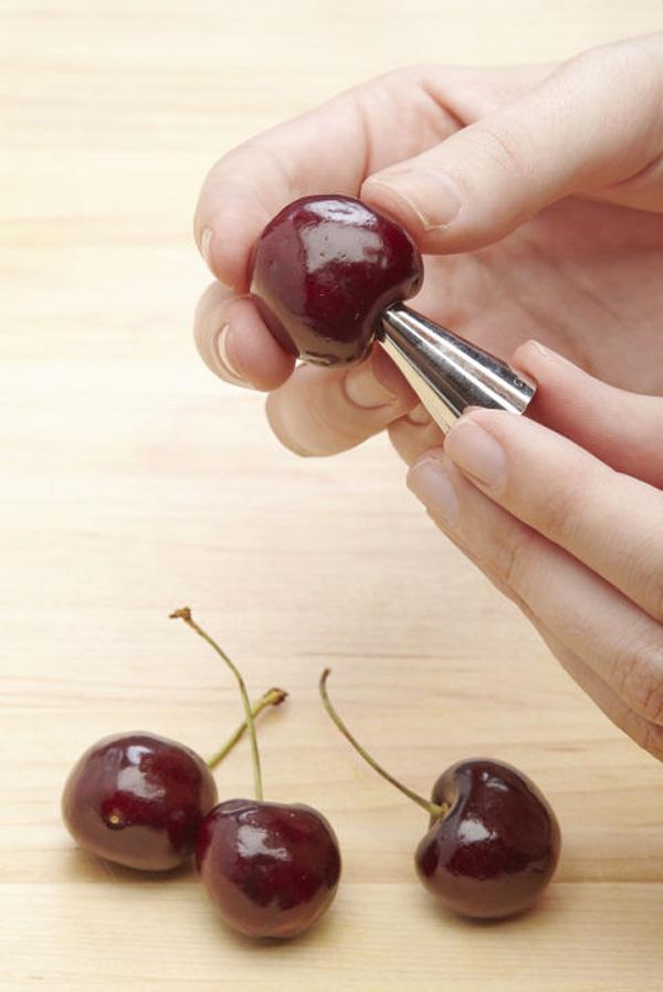 Để bỏ hạt cherry, bạn chỉ cần có một chiếc đui bắt kem thường dùng khi làm bánh hay ống hút. Vặt bỏ cuống của quả, đặt phần đầu nhọn của đui bắt kem vào và ấn mạnh, hạt cherry lập tức sẽ bay ra.