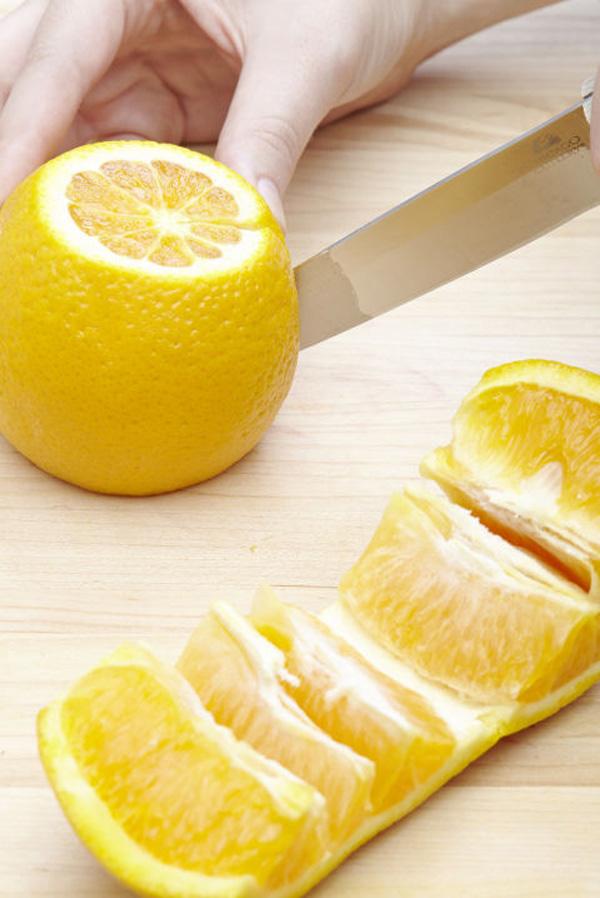 Thay vì bóc cam theo chiều dọc như thông thường bạn hãy cắt bỏ hai đầu quả cam, khứa một đường theo chiều dọc đến tận lõi và dùng tay "mở" quả cam ra từ đường rãnh đó là được. Từng múi cam sẽ "xếp hàng" ngay ngắn, đẹp mắt chỉ trong nháy mắt.