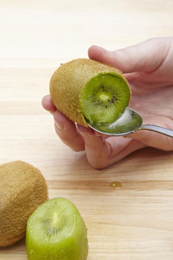 Thay vì phải dùng dao cắt gọt từng quả kiwi trơn trượt, bạn chỉ cần cắt bỏ một đầu quả sau đó lấy thìa lùa vào và xoáy sát phần vỏ và nhấc phần thịt kiwi ra.