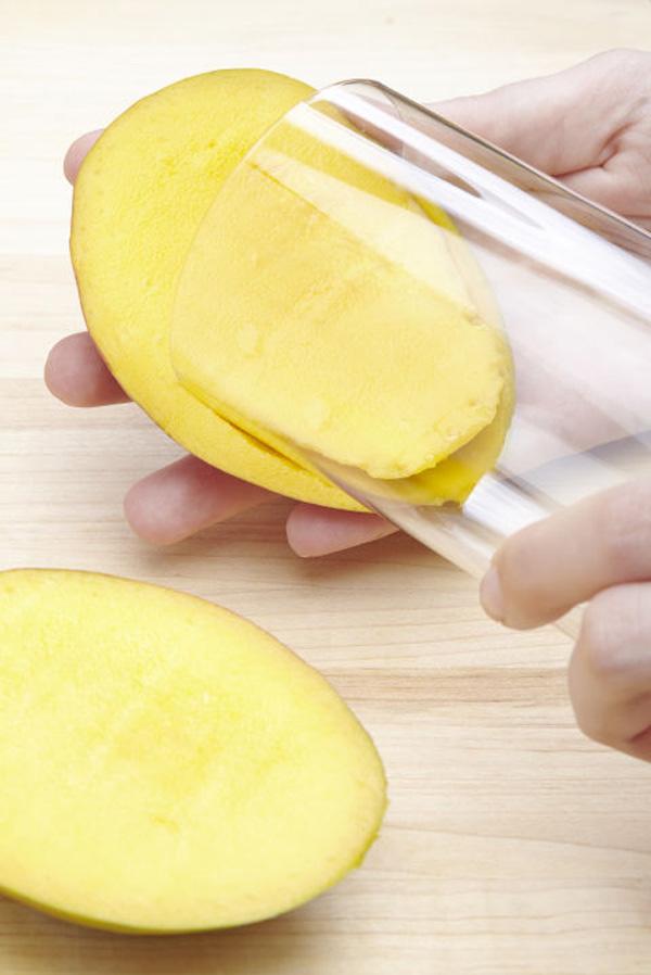 Không cần gọt vỏ, bạn chỉ cần cắt xoài ra, đặt miệng cốc vào một đầu và lướt nhẹ, phần thịt xoài sẽ tự động chui vào cốc một cách dễ dàng. Đương nhiên, cách này chỉ áp dụng được với xoài chín thôi!