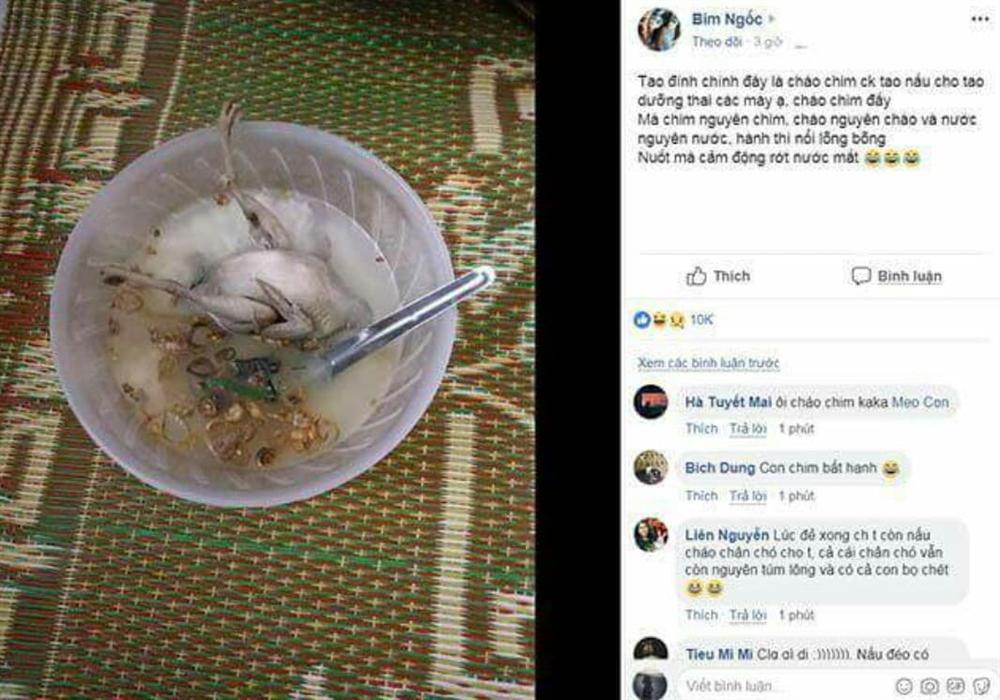 Thay vì ngưỡng mộ món cháo chim dưỡng thai của anh chồng dành cho vợ, cộng đồng mạng lại được một phen cười nắc nẻ bởi món cháo chim quá “bá đạo” này. Nguyên một con chim cút được đặt trong bát cháo hoa, nhiều người tự hỏi đây là cháo chim hay là nguyên một con chim luộc được đặt trong bát cháo.