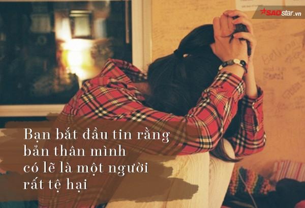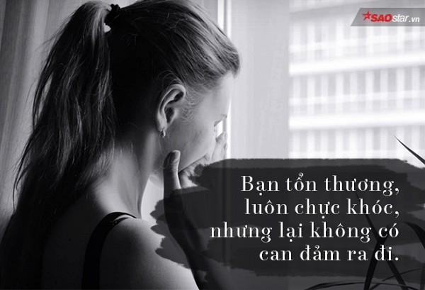 Bạn luôn rơi vào trạng thái cùng cực của nỗi buồn và gần như trầm cảm, luôn cảm thấy lo lắng bất an, chực khóc đến nơi. Bạn biết rõ rằng tất cả những buồn phiền mình đang phải chịu đựng nguyên do nguồn gốc chính là từ mối quan hệ hiện tại, vậy nhưng bạn lại không đủ can đảm để dứt bỏ. Giống như việc bạn biết đối phương có thể đang lừa dối mình, nhưng lại chọn cách âm thầm chấp nhận trong đau đớn thay vì ra đi bởi ở thời điểm hiện tại bạn không thể chịu đựng được việc sống mà không có người ấy.