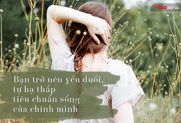 Sự tự tin của bạn giảm sút nghiêm trọng bởi vì bạn đang phải chịu đựng một tình yêu mông lung và mơ hồ. Bạn không bao giờ có cảm giác mình được trân trọng và quan tâm từ người ấy, vì vậy bạn bắt đầu tin rằng bản thân mình có lẽ là một người rất tệ hại nên mới không được yêu. Bạn không còn đủ sức để đối phó với sóng gió một mình, bạn thấy lạc lối và mất phương hướng vì thiếu tự tin vào bản thân. Bạn phải nhớ rằng, ở cạnh một người là để bản thân bạn thấy vui và hạnh phúc, thấy tự tin và phát triển bản thân, chứ không phải để thấy mình tệ hại như thế.