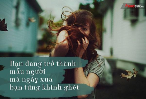 Bạn ghét con người mà mình đang trở thành nhưng bạn lại không tìm thấy được lối thoát nào khả dĩ. Bạn đánh mất sự tự tin của mình và không còn cảm thấy yêu thương chính bản thân mình nữa. Bạn thấy xấu hổ vì con người hiện tại, bởi bạn đang trở thành mẫu người mà ngày xưa bạn từng khinh ghét. Đó có thể là cảm giác khi bạn rất ghét những chuyện tình tay ba nhưng cuối cùng lại yêu phải một người đã có người yêu, là khi bạn không thích bản thân mình trở thành một người hay tra khảo hạch sách người yêu nhưng cuối cùng vì bị lừa dối mà lại sợ hãi ra sức quản lý hết mực. Cảm giác đó thật sự rất tồi tệ.
