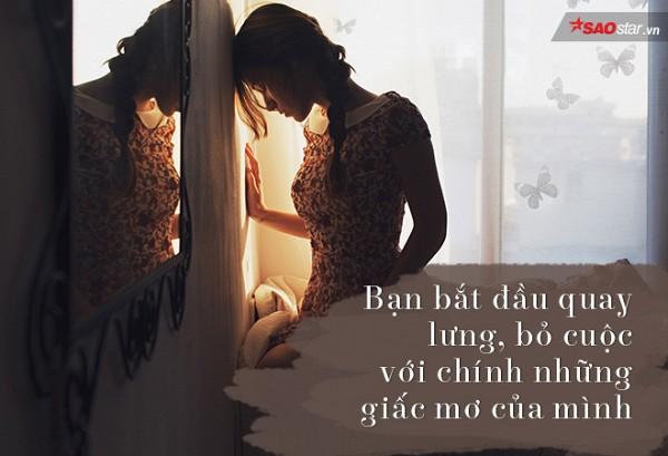 Bạn không còn cảm giác muốn theo đuổi giấc mơ của bản thân bởi vì bạn muốn ở yên bên cạnh người nào đó. Bạn bị đánh lừa bởi cảm giác muốn sống một cuộc đời yên bình nhàn hạ bên một người mãi mãi về sau mà dần quên đi những hoài bão tuổi trẻ của mình. Bạn đơn giản là không còn tham vọng, không còn đam mê, không còn cương quyết theo đuổi những gì mình thích nữa. Bạn bắt đầu bỏ cuộc dễ dàng vì nghĩ rằng mình có người ấy là đủ, nhưng bạn có từng nghĩ nếu người ấy rời bỏ bạn, bạn còn lại gì ngoài bản thân mình để tiếp tục đứng lên?