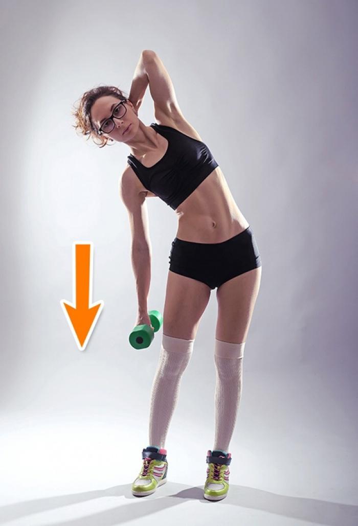 Đứng thẳng, cầm tạ nhỏ ở một tay, tay còn lại để sau gáy. Từ từ nghiêng người sang một bên, hạ thấp tạ hết mức có thể. Trở về tư thế ban đầu rồi đổi bên. Lặp lại động tác 15 lần x 3 hiệp.