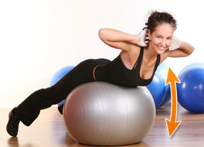Nằm sấp lên một quả bóng lớn, mũi chân chống xuống đất, hai tay để sau gáy. Thực hiện động tác gập bụng 20 lần x 3 hiệp.
