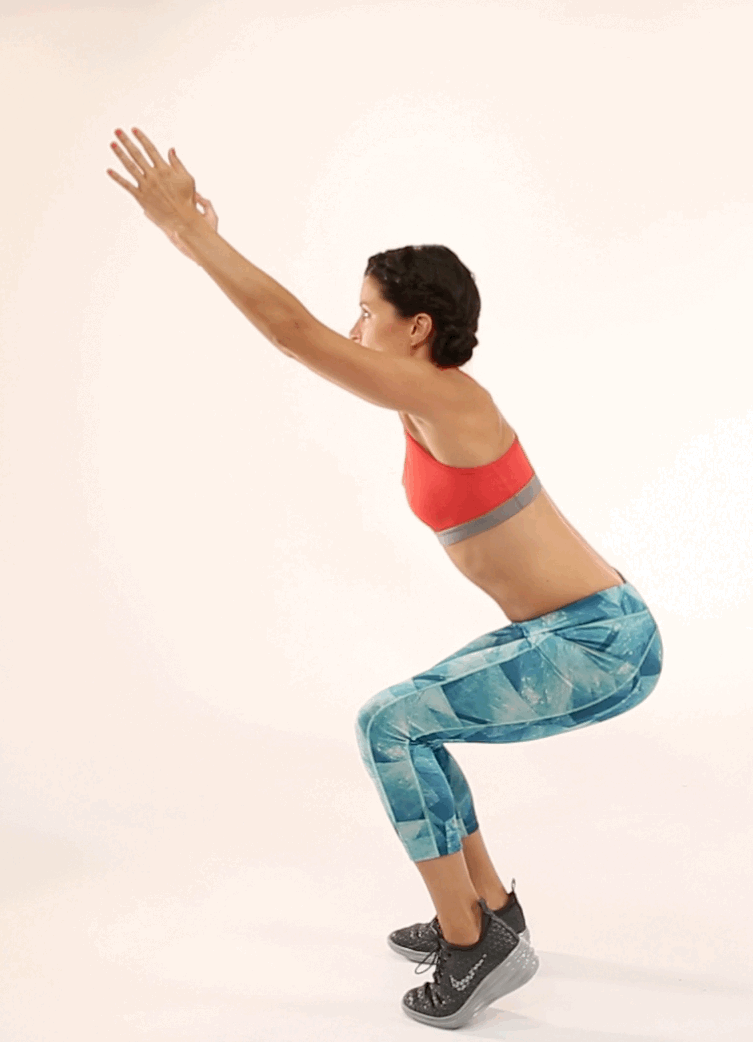 Thực hiện: Ngồi xuống sao cho đầu gối vuông góc, hông đẩy ra sau.