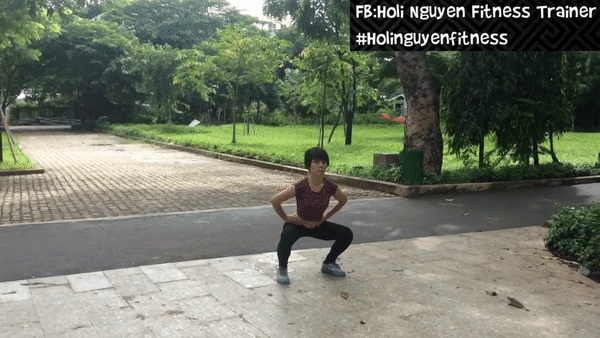 Thở ra và bật nhảy lên phía trước mặt và squat xuống, đùi song song với mặt đất.