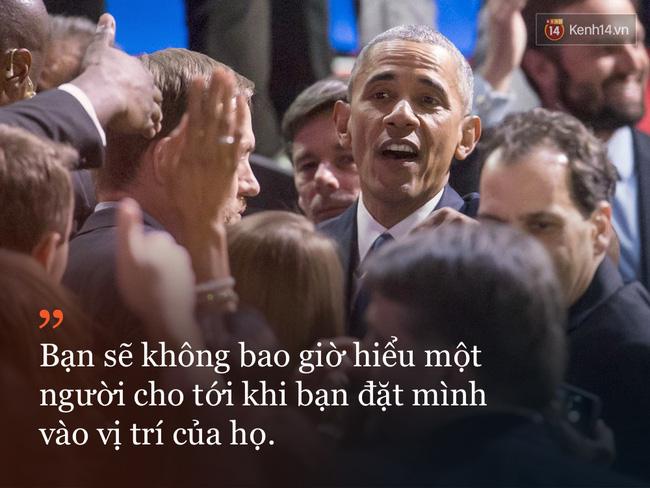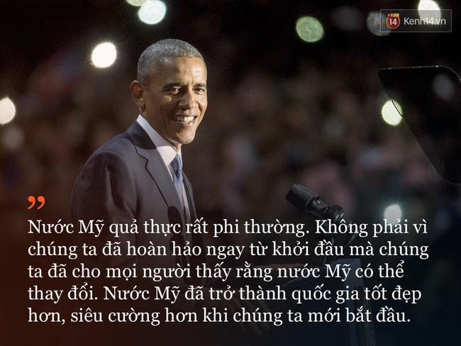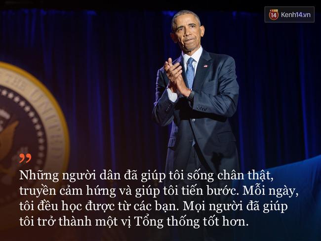 "Những người dân đã giúp tôi sống chân thật, truyền cảm hứng cho tôi và giúp tôi tiến bước. Mỗi ngày, tôi đều học được từ các bạn. Mọi người đã giúp tôi trở thành một vị Tổng thống tốt hơn", Obama nói.